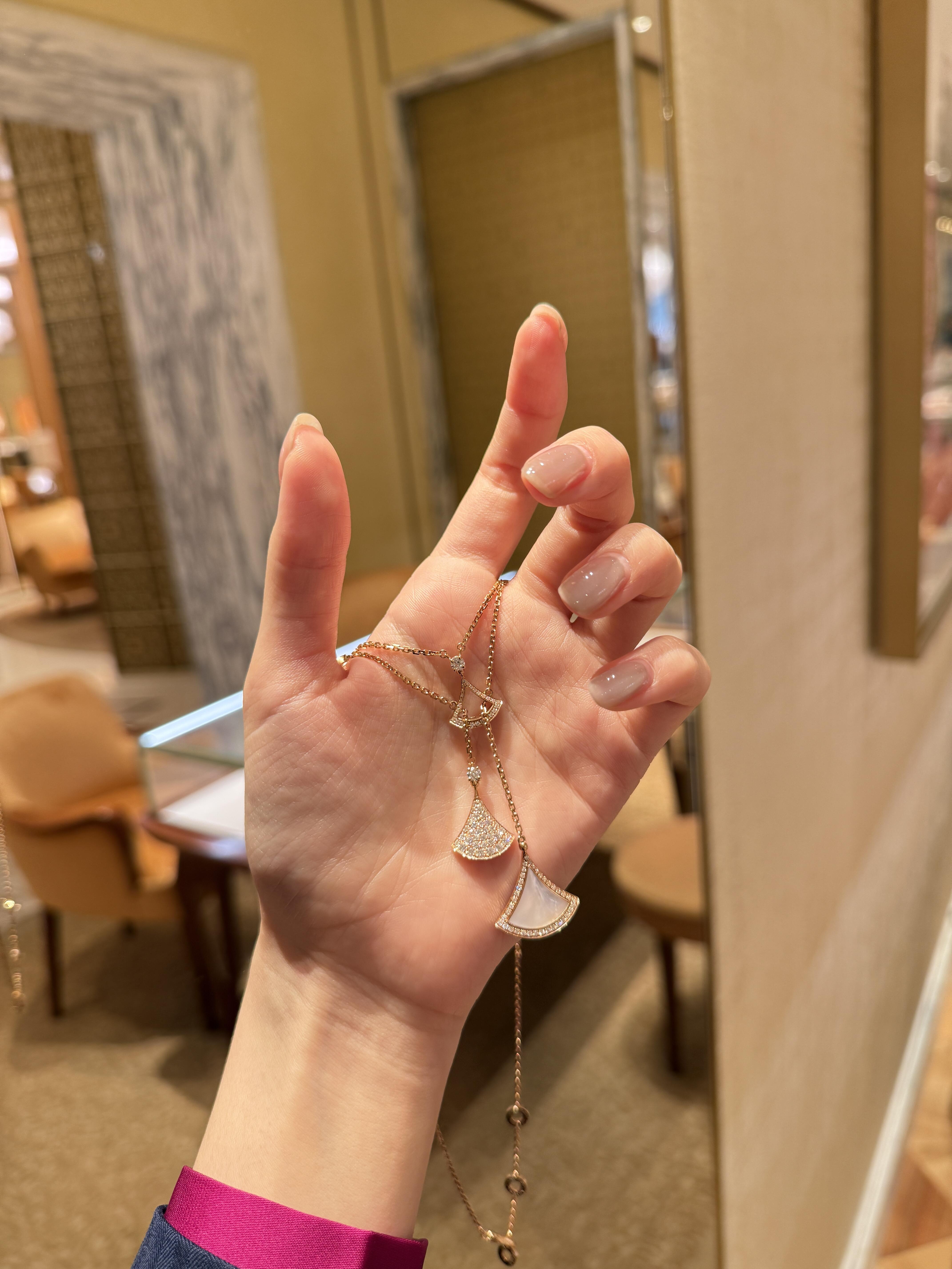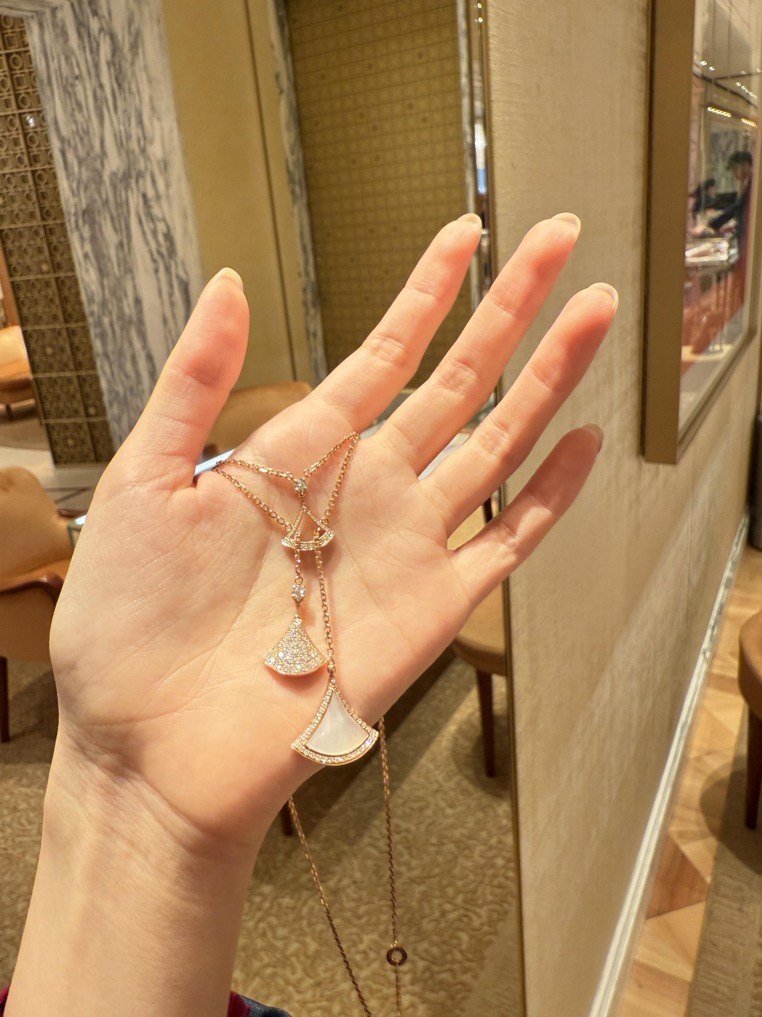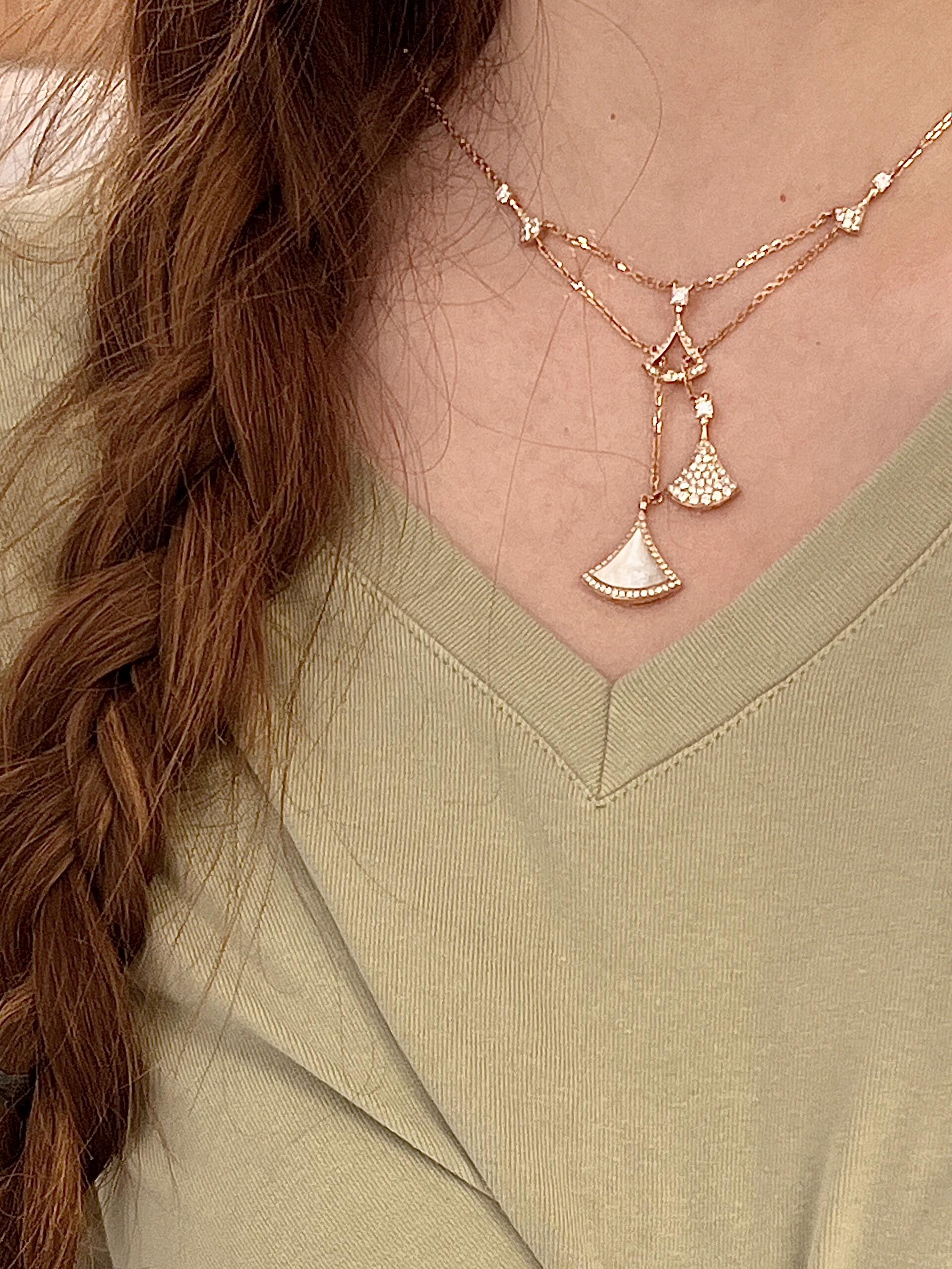 تجسيد أنيق للسحر الإيطالي، يكرم عقد "ديفاز دريم" من الذهب الوردي عيار 18 قيراطاً أروع النجمات بروح رومانية لا لبس فيها. بإلهام من الأناقة الأنثوية صنع شعار المجموعة الأيقوني المروحي الشكل من ثلاثة أشكال مختلفة، جزء مخرم وقلادتين إحداهما مرصعة بأجزاء من عرق اللؤلؤ والأخرى بالألماس المرصوف. بصمة متميزة تستحضر الأنماط المثيرة لفسيفساء كاراكلّا الرومانية في تكريم للجمال الكلاسيكي.