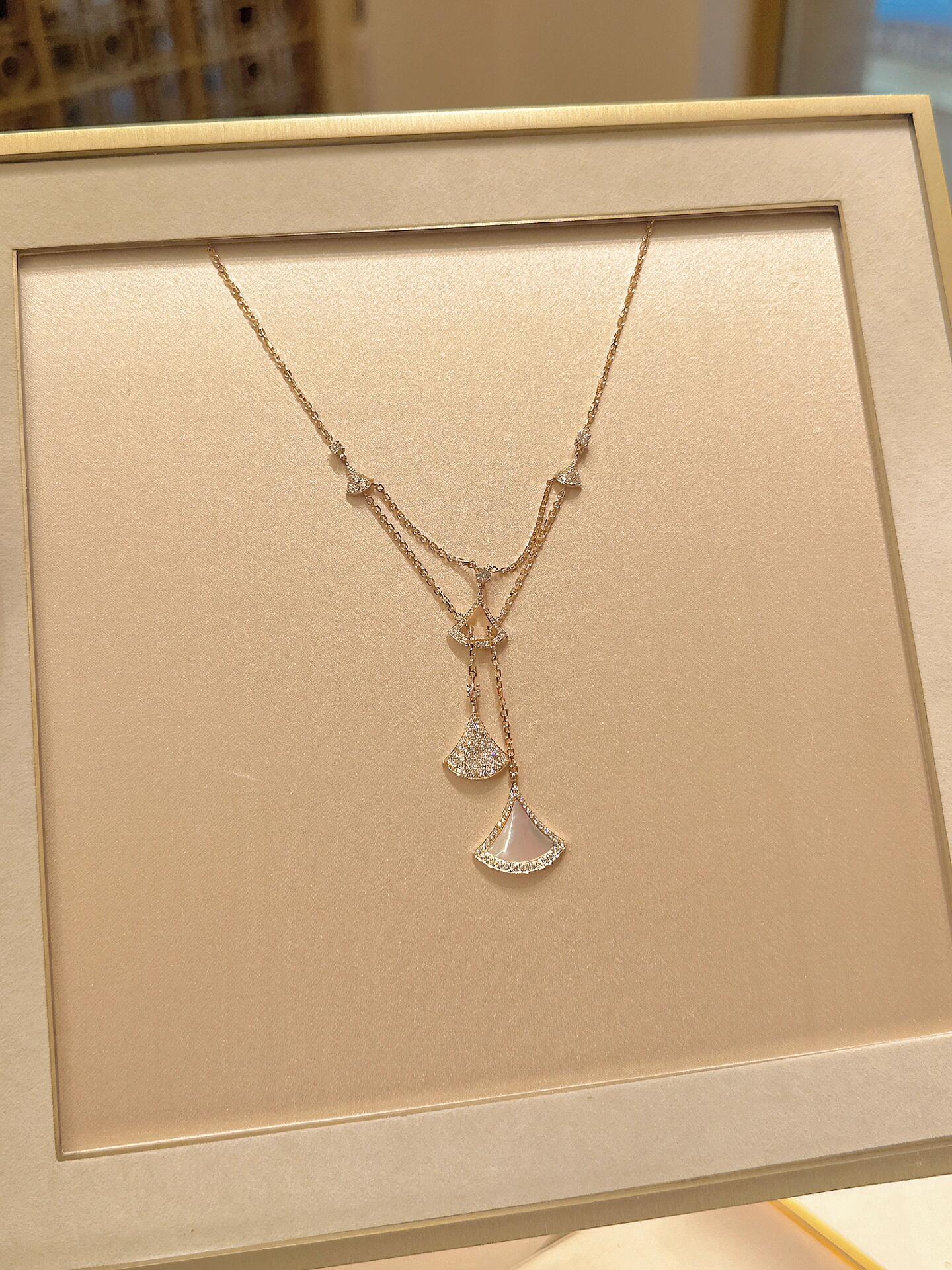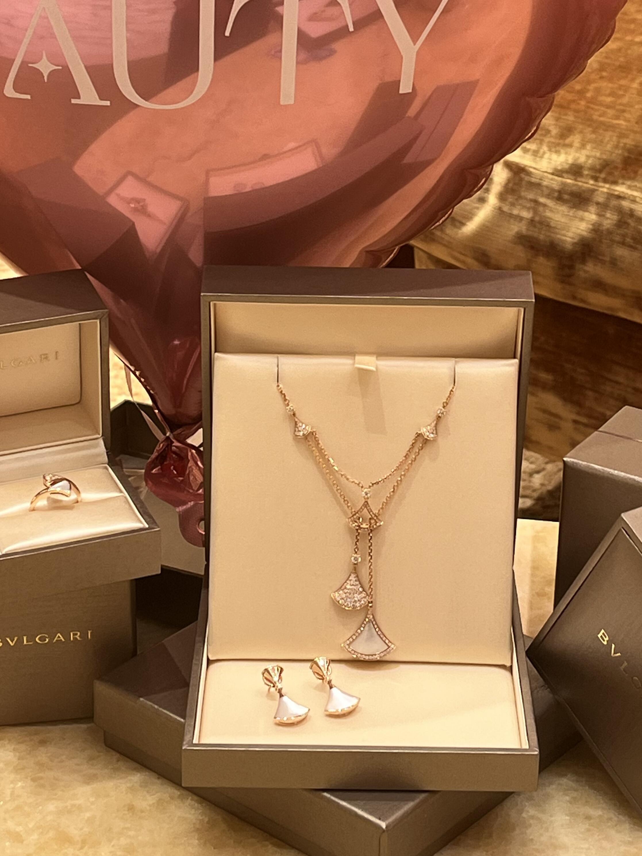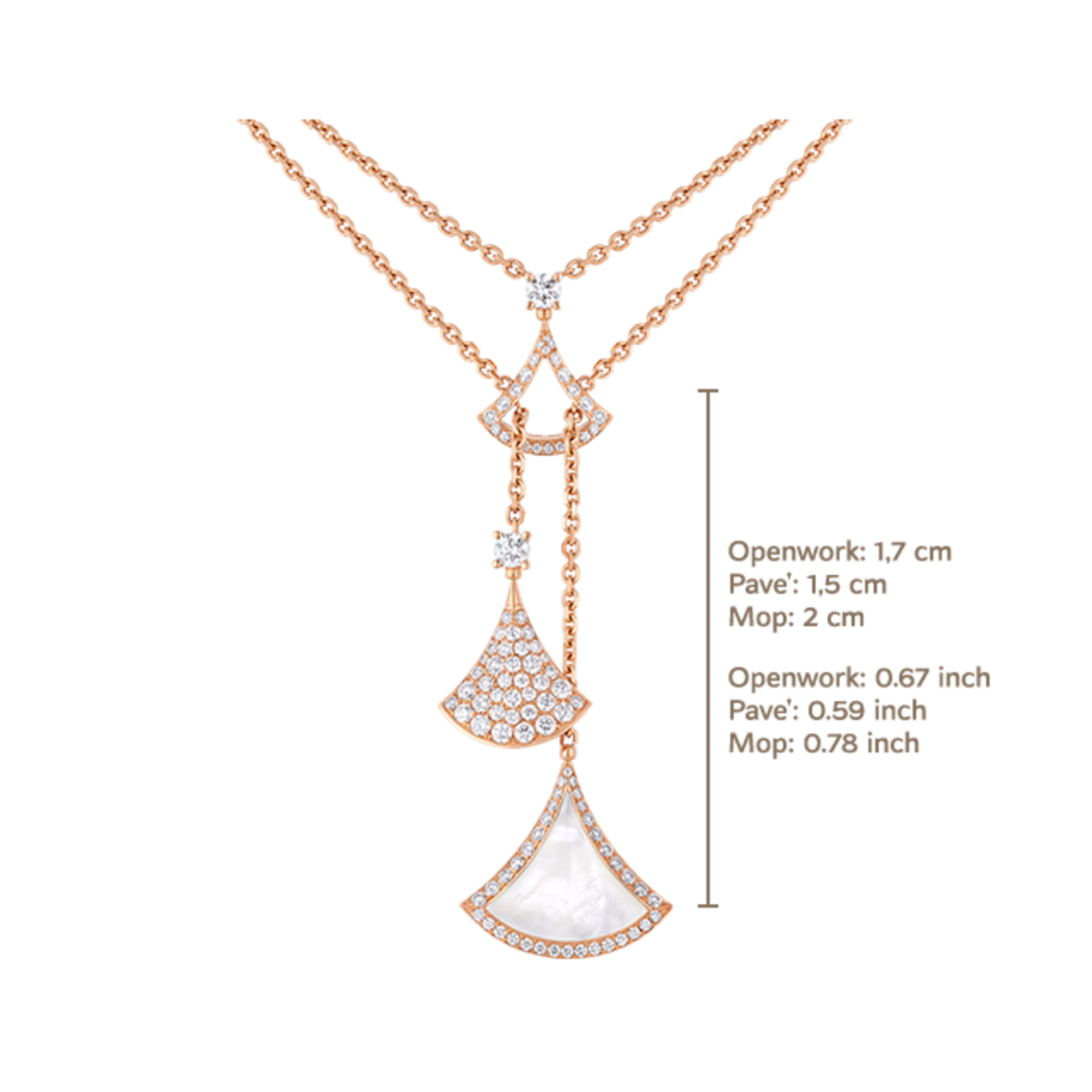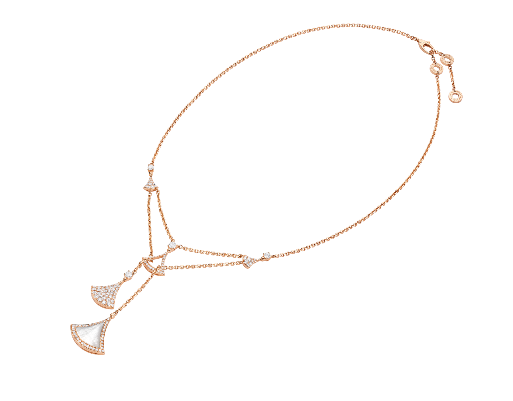 تجسيد أنيق للسحر الإيطالي، يكرم عقد "ديفاز دريم" من الذهب الوردي عيار 18 قيراطاً أروع النجمات بروح رومانية لا لبس فيها. بإلهام من الأناقة الأنثوية صنع شعار المجموعة الأيقوني المروحي الشكل من ثلاثة أشكال مختلفة، جزء مخرم وقلادتين إحداهما مرصعة بأجزاء من عرق اللؤلؤ والأخرى بالألماس المرصوف. بصمة متميزة تستحضر الأنماط المثيرة لفسيفساء كاراكلّا الرومانية في تكريم للجمال الكلاسيكي.