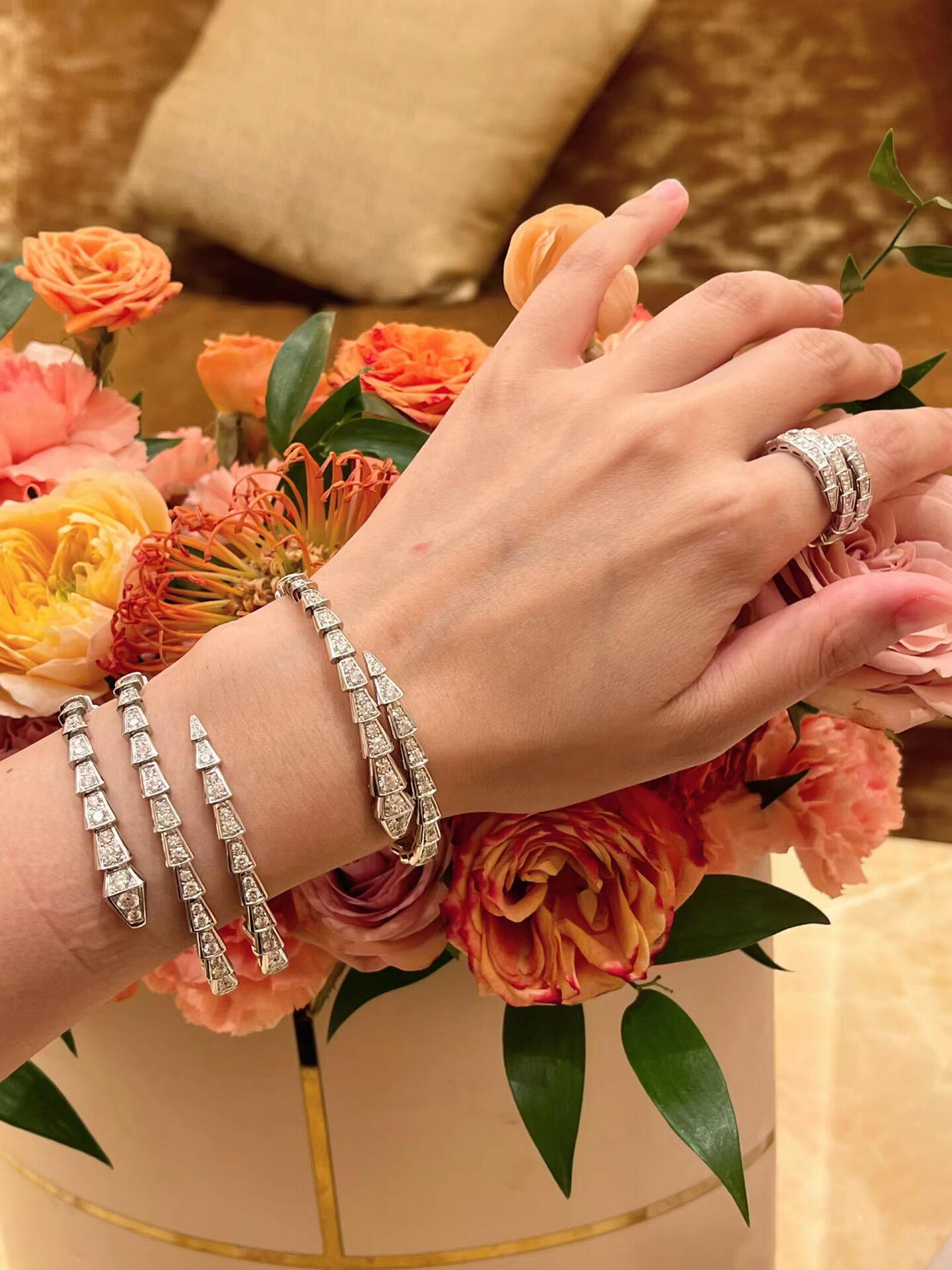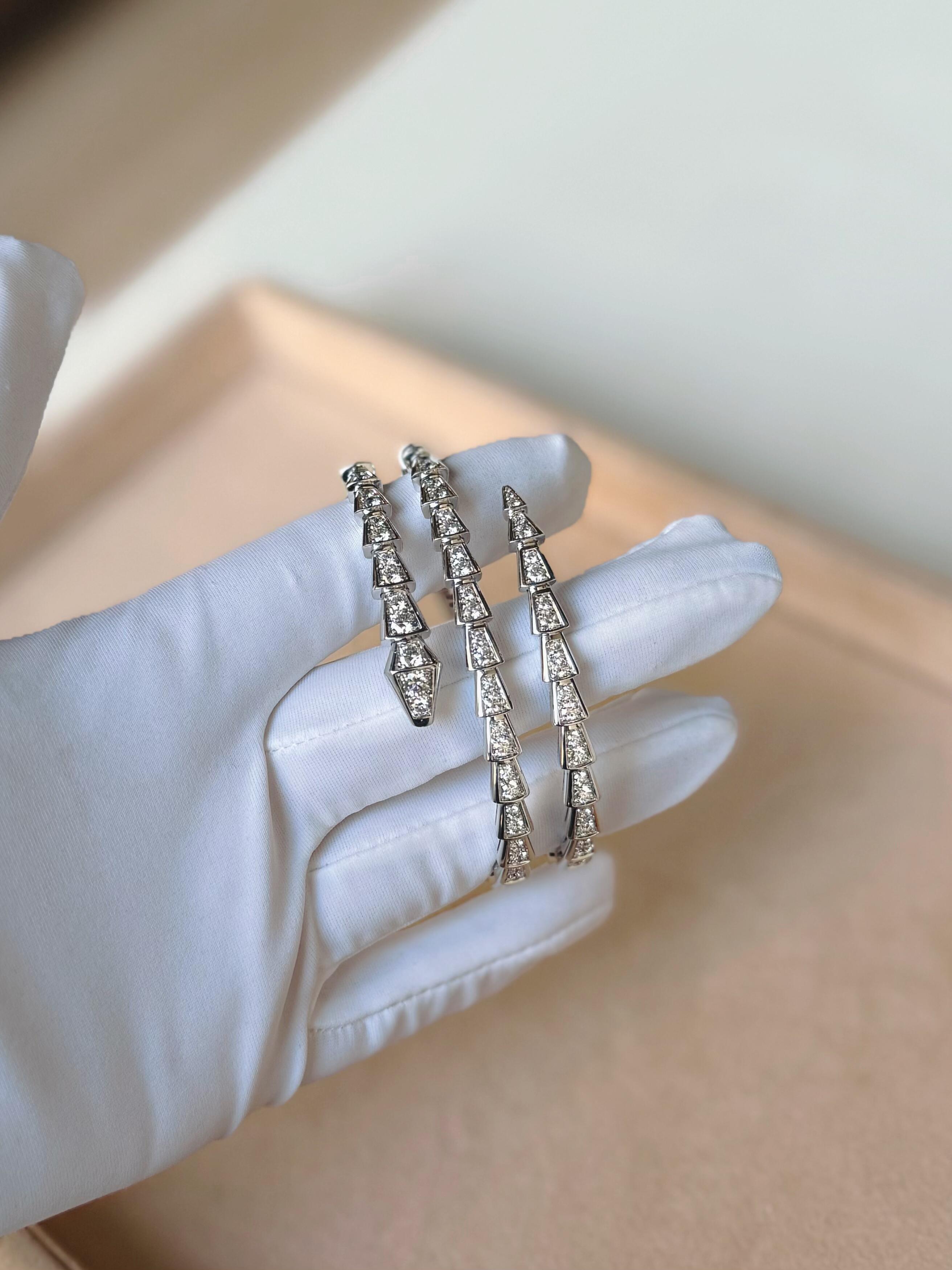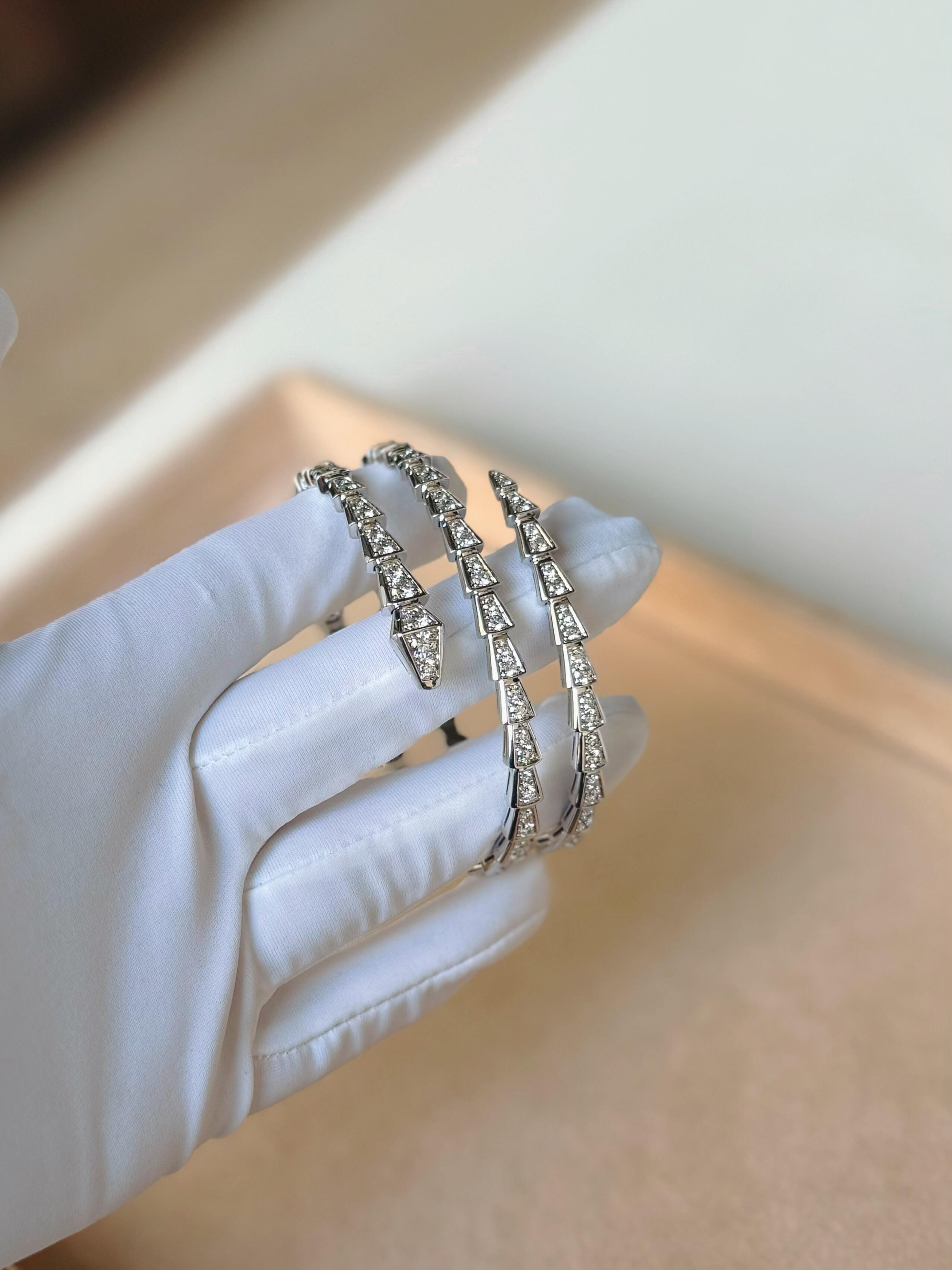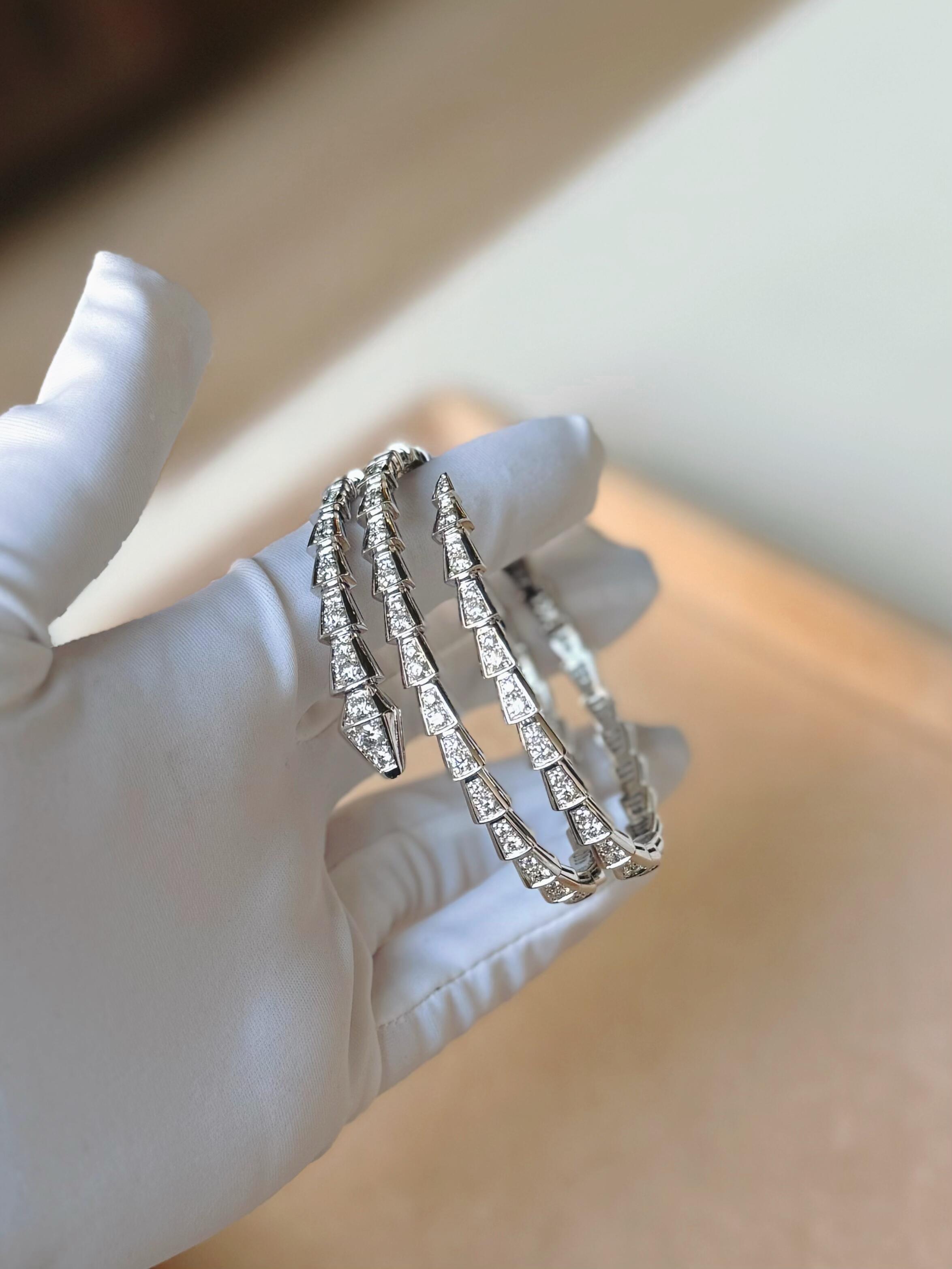 تقديراً للثعبان الذي يمثل روحها، قامت بولغري بغرس قوة الإغواء في سوار سيربنتي فايبر المفعم بالجاذبية في تصميمه الآسر. تلتف قطعة المجوهرات الأنيقة حول المعصم لتتألق بجمال الحراشف الفاخر وبانسيابية الثعبان المتميزة.