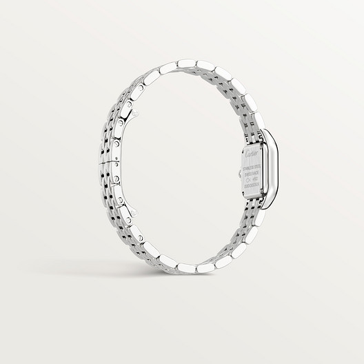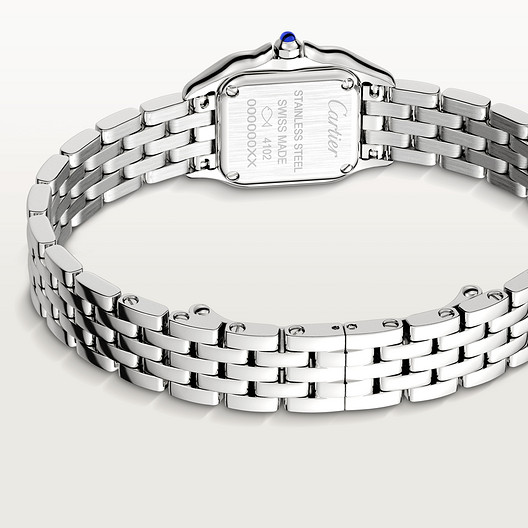 Panthère de watch, mini model, quartz movement. Steel case and bracelet. Octagonal crown set with a blue synthetic spinel. Silvered dial, blued-steel sword-shaped hands, sapphire crystal. Dimensions: 25 mm x 21 mm, thickness: 6 mm. Water-resistant to 3 bar (approx. 30 metres).