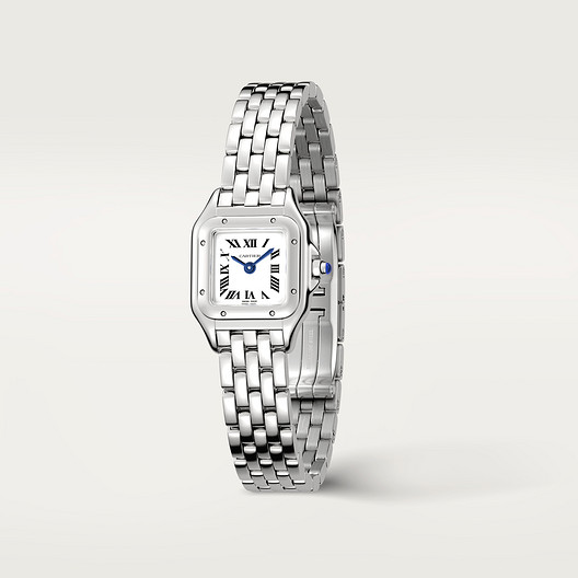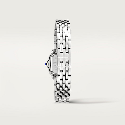 Panthère de watch, mini model, quartz movement. Steel case and bracelet. Octagonal crown set with a blue synthetic spinel. Silvered dial, blued-steel sword-shaped hands, sapphire crystal. Dimensions: 25 mm x 21 mm, thickness: 6 mm. Water-resistant to 3 bar (approx. 30 metres).