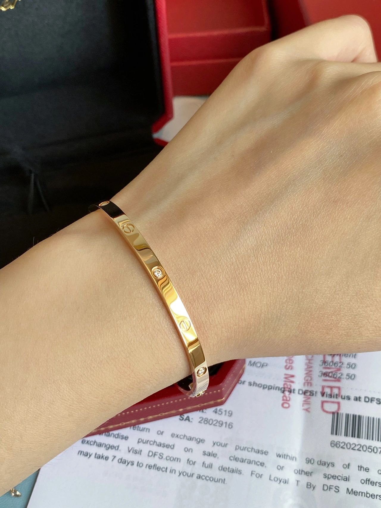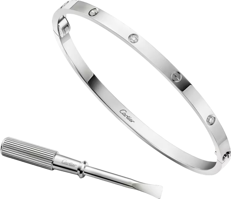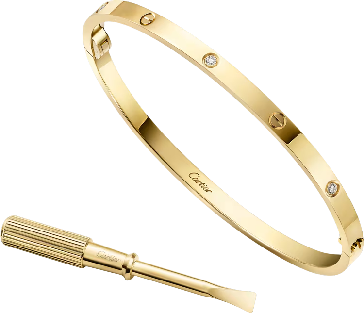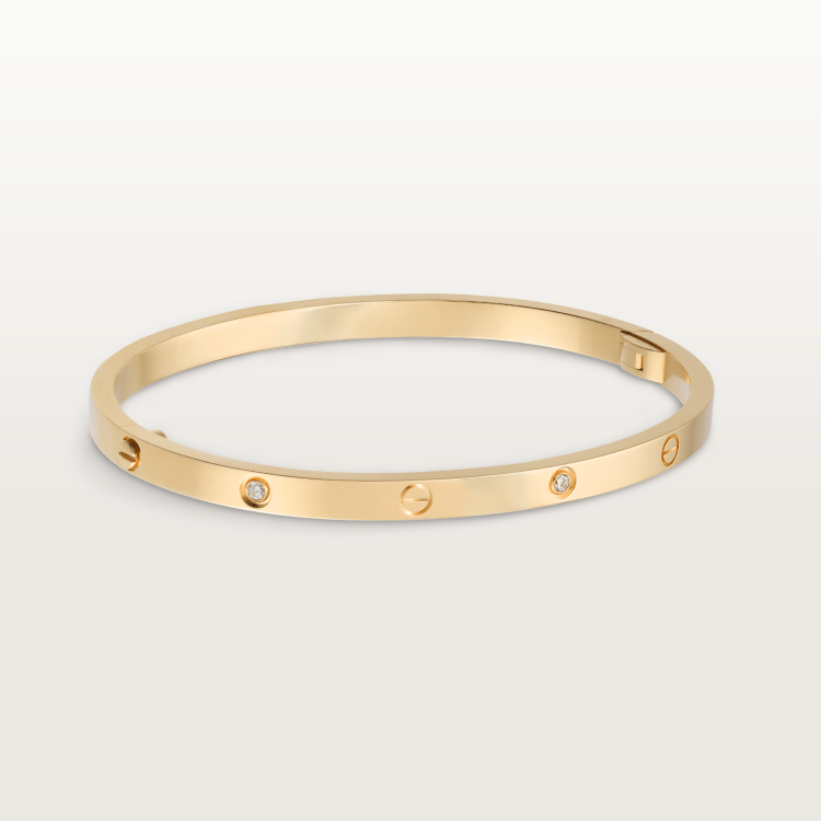 سوار من مجموعة LOVE، موديل الحجم الصغير، مصنوع من الذهب الأصفر 750/1000، ومرصّع بـ 6 ماسات تزن معًا 0.15 قيراط. يُباع مع مفك براغي. العرض 3.65 مم، السماكة 2.05 مم (للمقاس 17). تواصل كارتييه قصة سوار LOVE مع نسخة أرفع حيث حافظت على نفس التصميم ونفس الشكل البيضاوي لتروي نفس قصة هذا الإبداع العابر للزمن ولكن بنسخة رفيعة تثبَّت بواسطة مفك براغي. يتكوّن نظام الإغلاق من برغي عملي على جهة من السوار ومن مفصل على الجهة