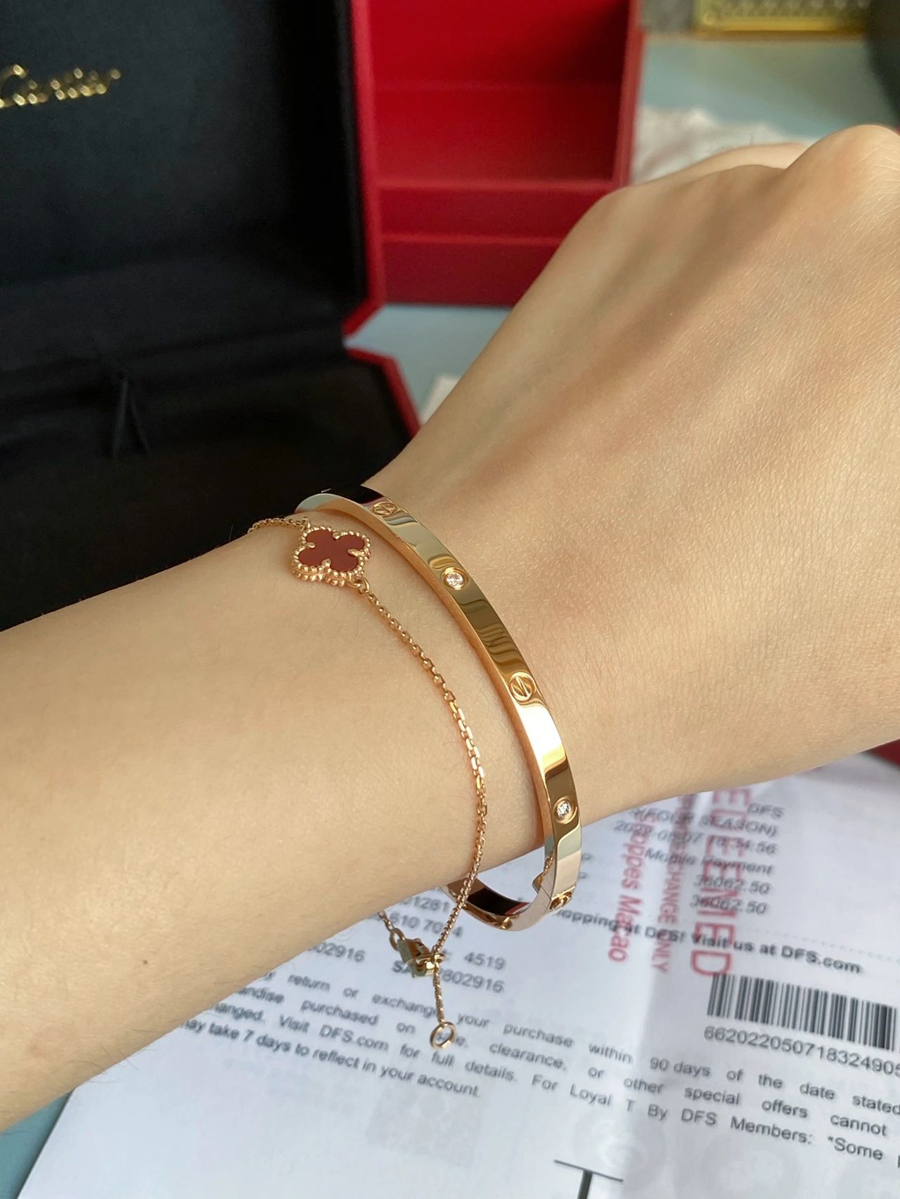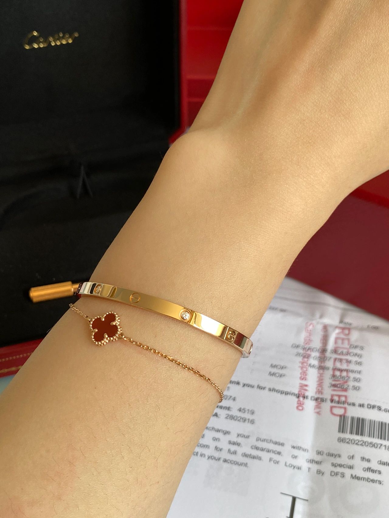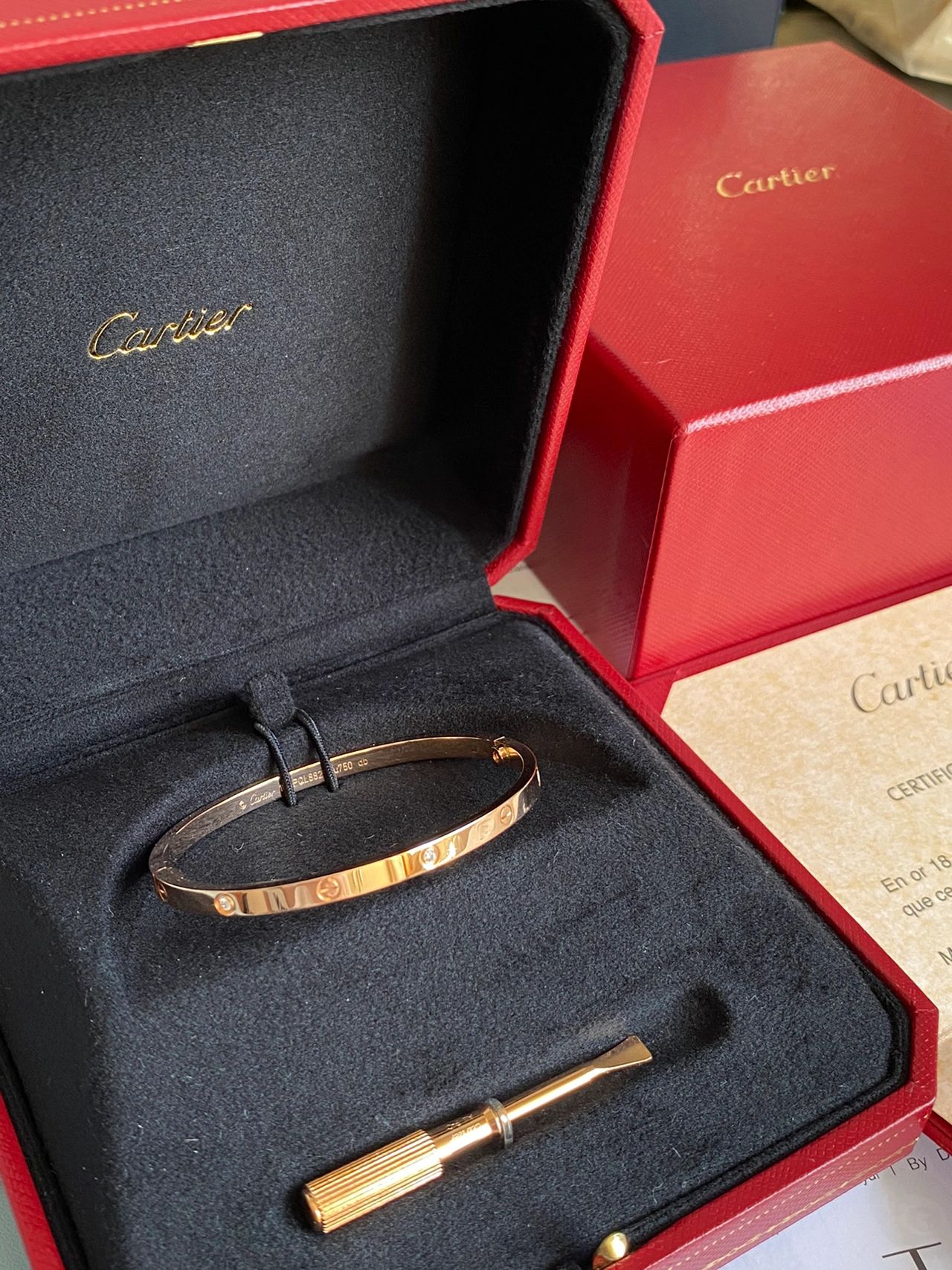 سوار من مجموعة LOVE، موديل الحجم الصغير، مصنوع من الذهب الأصفر 750/1000، ومرصّع بـ 6 ماسات تزن معًا 0.15 قيراط. يُباع مع مفك براغي. العرض 3.65 مم، السماكة 2.05 مم (للمقاس 17). تواصل كارتييه قصة سوار LOVE مع نسخة أرفع حيث حافظت على نفس التصميم ونفس الشكل البيضاوي لتروي نفس قصة هذا الإبداع العابر للزمن ولكن بنسخة رفيعة تثبَّت بواسطة مفك براغي. يتكوّن نظام الإغلاق من برغي عملي على جهة من السوار ومن مفصل على الجهة