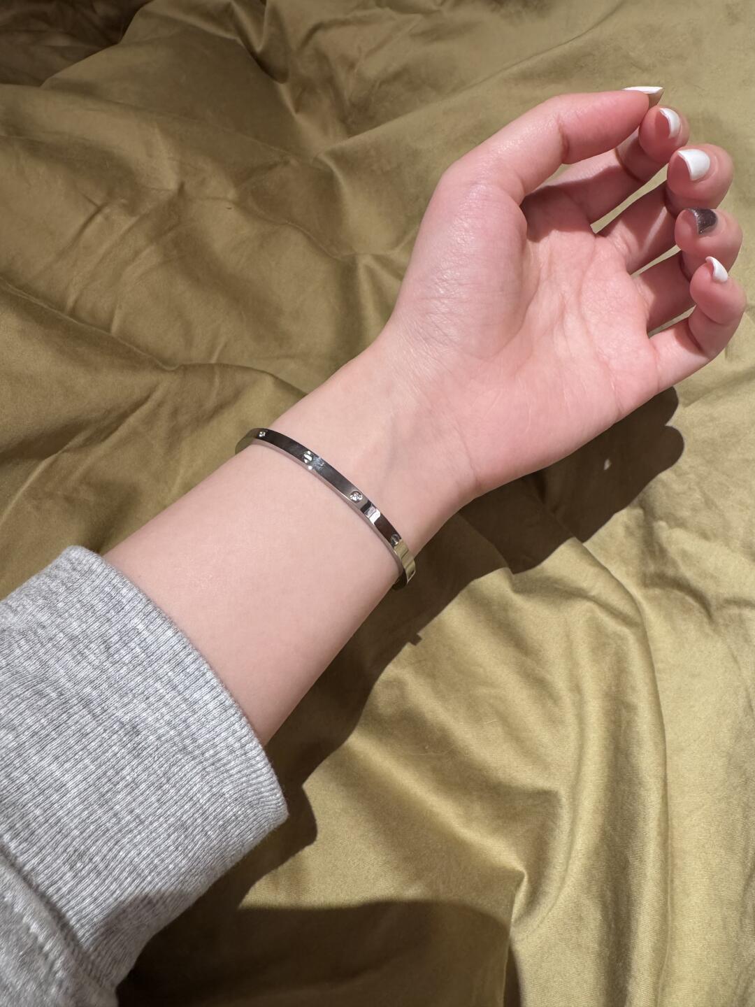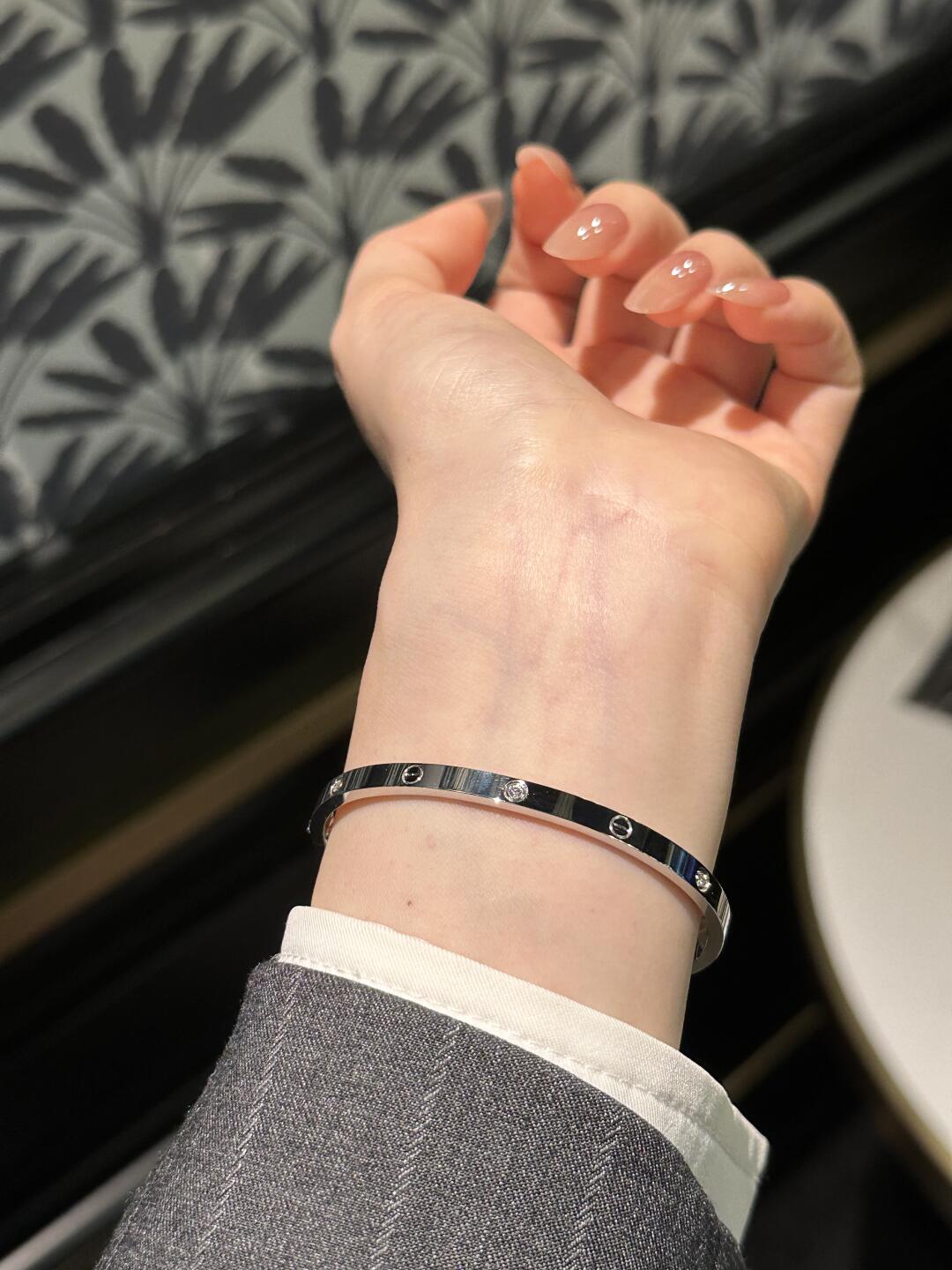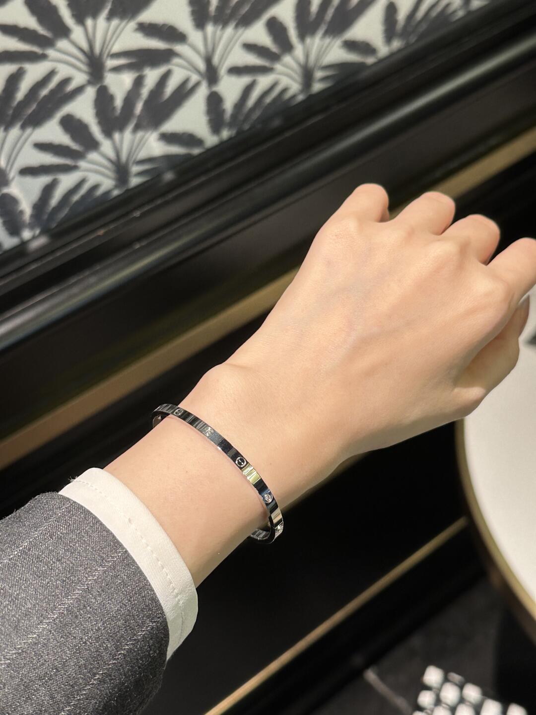 سوار من مجموعة LOVE، موديل الحجم الصغير، مصنوع من الذهب الأصفر 750/1000، ومرصّع بـ 6 ماسات تزن معًا 0.15 قيراط. يُباع مع مفك براغي. العرض 3.65 مم، السماكة 2.05 مم (للمقاس 17). تواصل كارتييه قصة سوار LOVE مع نسخة أرفع حيث حافظت على نفس التصميم ونفس الشكل البيضاوي لتروي نفس قصة هذا الإبداع العابر للزمن ولكن بنسخة رفيعة تثبَّت بواسطة مفك براغي. يتكوّن نظام الإغلاق من برغي عملي على جهة من السوار ومن مفصل على الجهة