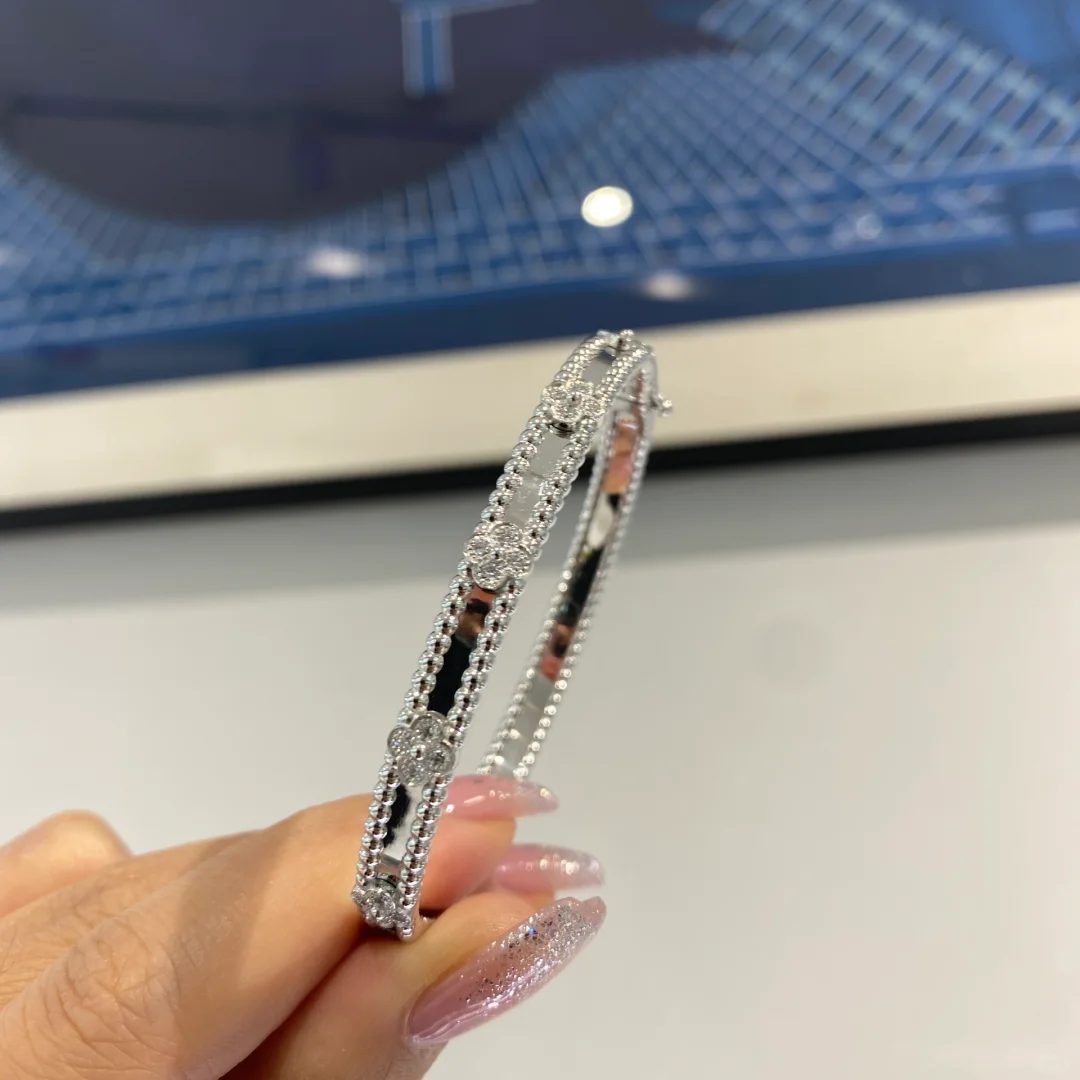 سوار بيرليه سويت كلوفرز، ذهب أبيض مطلي بالروديوم 18 قيراط، ماس مستدير، موديل متوسط؛ فئة الماس DEF وIF إلى VVS.