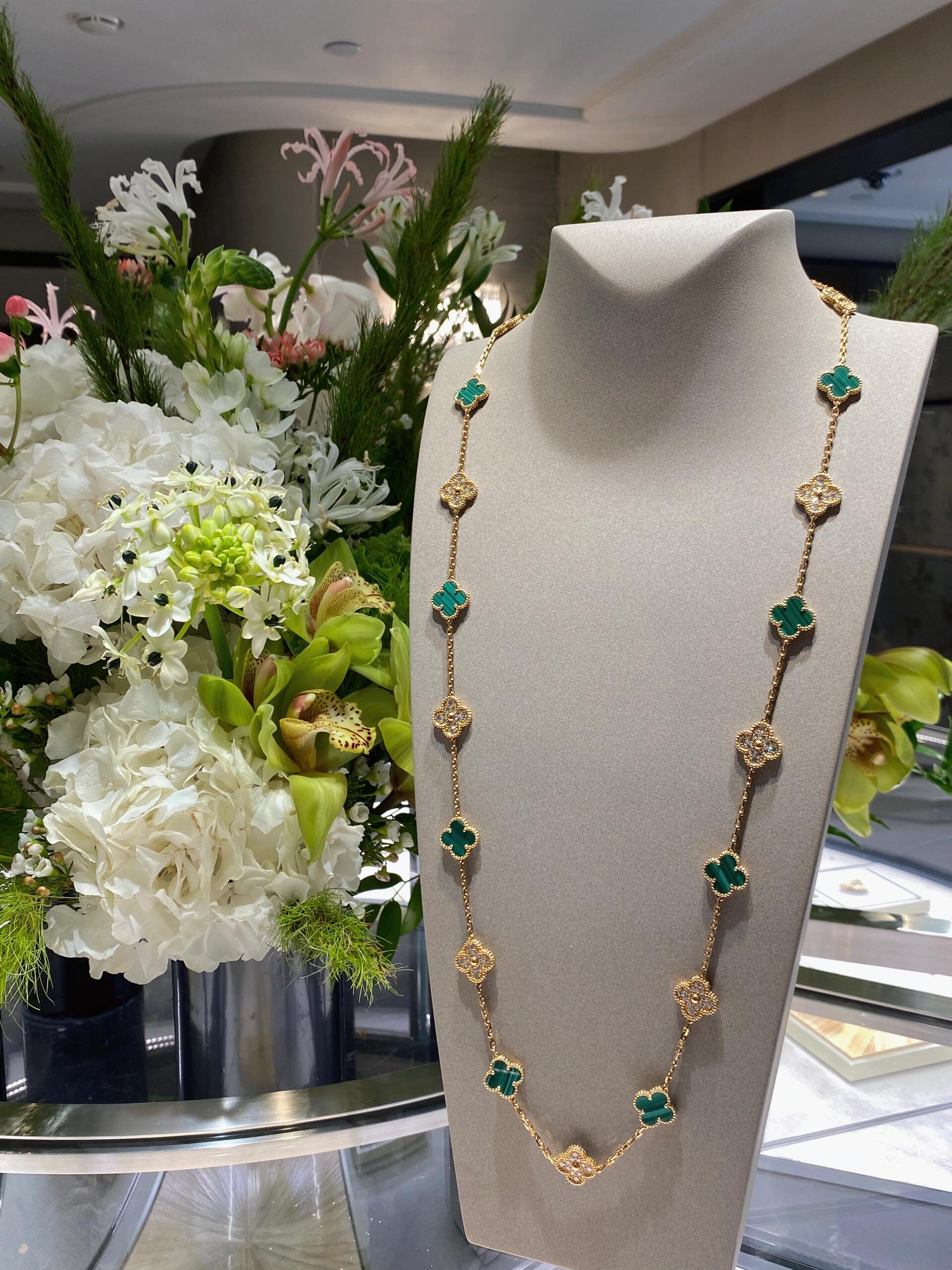 عقد فينتاج ألامبرا الطويل، 20 حلية زخرفية، ذهب أصفر 18 قيراط، مالاكيت، ماس مستدير، الماس فئة DEF وIF إلى VVS.